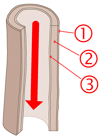 Muskelschicht (sog. "Media"; ‚2') und eine innere Schicht aus