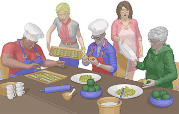 Tagesgäste über ihre Erlebnisse hinsichtlich des Backens sprechen.