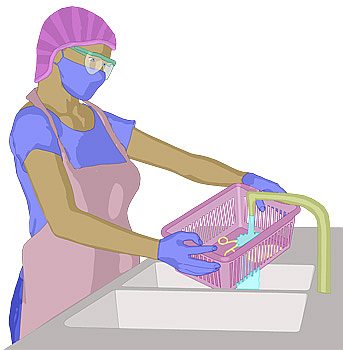 Die Instrumente werden geöffnet oder falls möglich zerlegt in die Desinfektionsmittellösung eingelegt. (Scheren, Klemmen usw.)