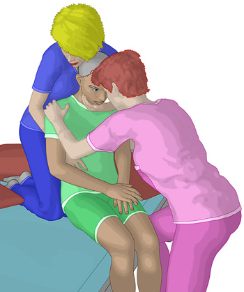 "Transfer von der Bettkante in die Rückenlage mit zwei Pflegekräften