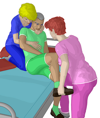 Bettkante in die Rückenlage mit zwei Pflegekräften bei Hemiplegie"