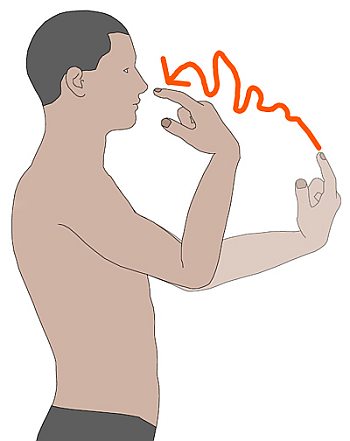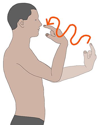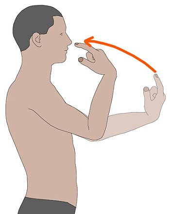 einen Bogen. Je näher der Finger der Nasenspitze kommt, umso mehr