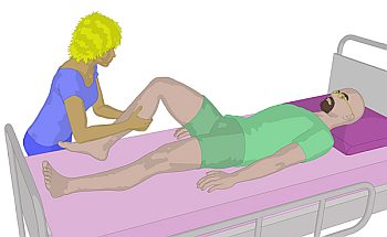 Pflegekraft das Bein mit dem Arm an. Das Bein wird ggf. durch ein