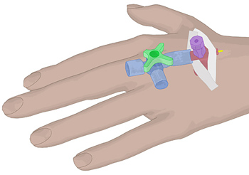 Kanüle. Der an der Kanüle angebrachte Dreiwegehahn darf nicht überklebt