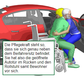 Die Pflegekraft stellt dafür ggf. selbst einen Fuß in den Fußraum, um