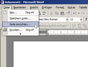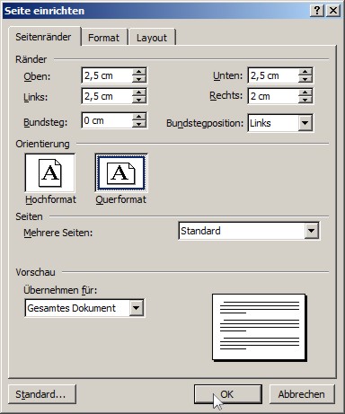 Querformat wechseln. Klicken Sie auf "Datei", dann auf "Seite