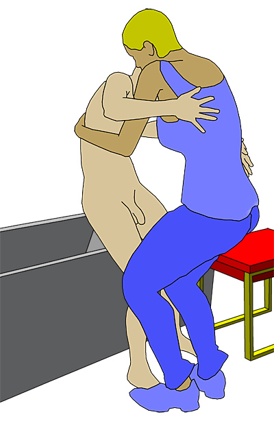 Wanne zu drehen und sich auf den Wannenrand zu setzen.