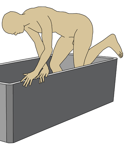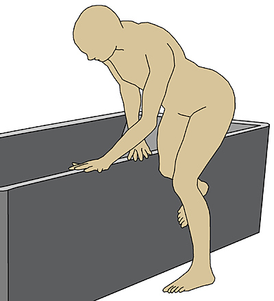 seinen Körperschwerpunkt in Richtung Wanne. Er stellt das Bein in der
