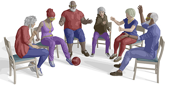 - Die Tagesgäste bilden einen Kreis aus Stühlen.