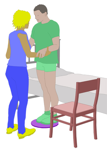 - Die Pflegekraft zieht den Bewohner in den Stand. Der Bewohner soll diese Bewegung mit der Kraft seiner Arme aktiv unterstützen.
