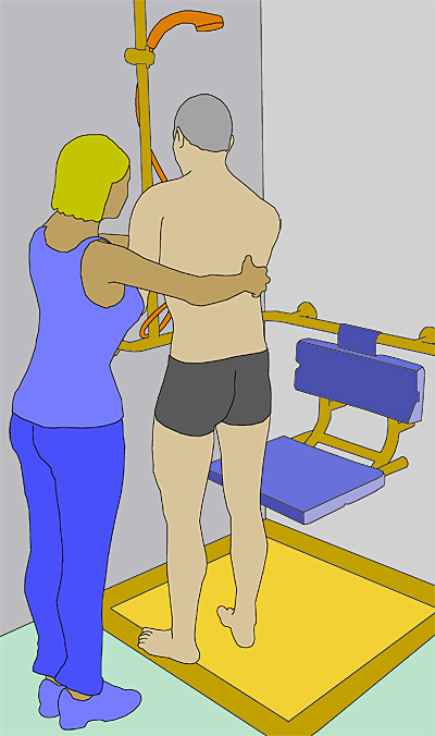 notwendig, setzt sie den Bewohner auf den Duschstuhl