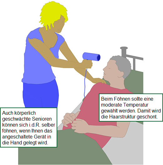 aufgerichtet. Die Pflegekraft frottiert die Haare
