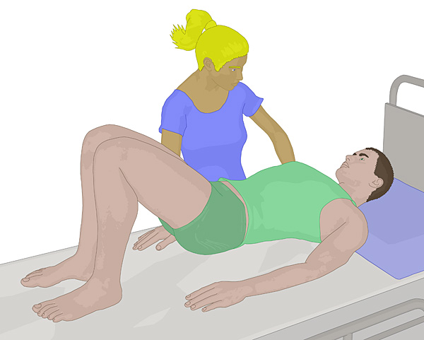 - Der Bewohner winkelt die Knie an und stellt die Füße in Gesäßnähe auf der Matratze auf.