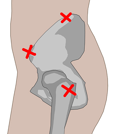 - dem großen Rollhügel, Trochanter major (Kreuz unten).