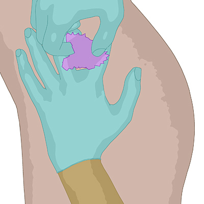 - Der Handballen der Pflegekraft sollte jetzt auf dem großen Rollhügel liegen.