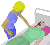 - Die Pflegekraft betritt den Raum. Sie stellt sich neben das Bett des Bewohners.