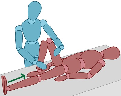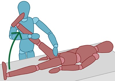 Bettes, auf der auch das zu bewegende Gelenk liegt. Die Pflegekraft