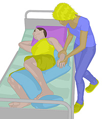 - Der Bewohner wird auf die Seite gedreht. Hinter seinem Rücken werden die für die Lagerung benötigten Kissen platziert.