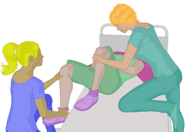 abgestellt ist, kann die zweite Pflegekraft das Knie des weniger